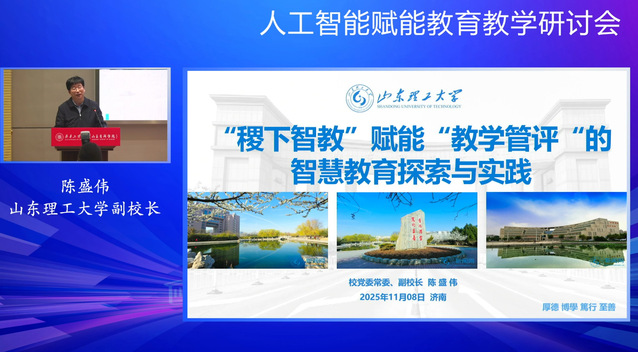 2025年11月8日,人工智能赋能教育教学研讨会在齐鲁工业大学(山东省科学院)举办,山东省教育厅高教处处长曾宪文,清华大学在线教育中心副主任徐燊,齐鲁工业大学(山东省科学院)书记吴衍涛等出席会议。学校党委常委、副校长陈盛伟受邀出席并作题为《“稷下智教”赋能“教学管评”的智慧教育探索与实践》的报告。